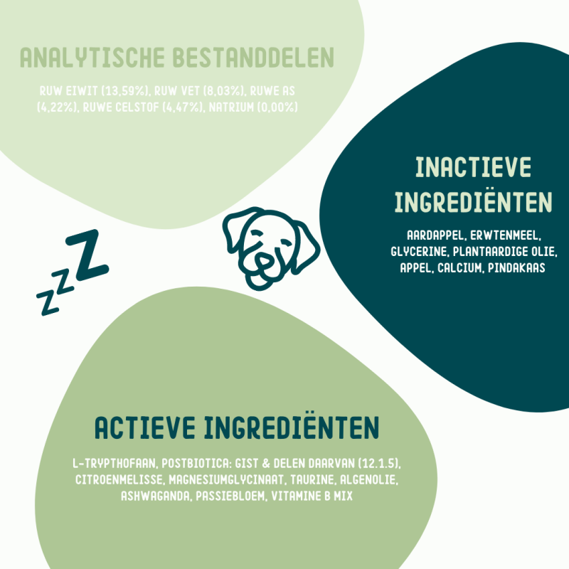 L-tryptofaan 250mg/chew, Postbiotica: Gist en zijn onderdelen 115mg/chew, Citroenmelisse 110mg/chew, Magnesiumchloride 110mg/chew, Taurine 75mg/chew, Algenolie 60mg/chew, Ashwaganda 38mg/chew, Passiebloem 38mg/chew, Vitamine B-mix (B1, B2, B6, B12) 22mg/chew