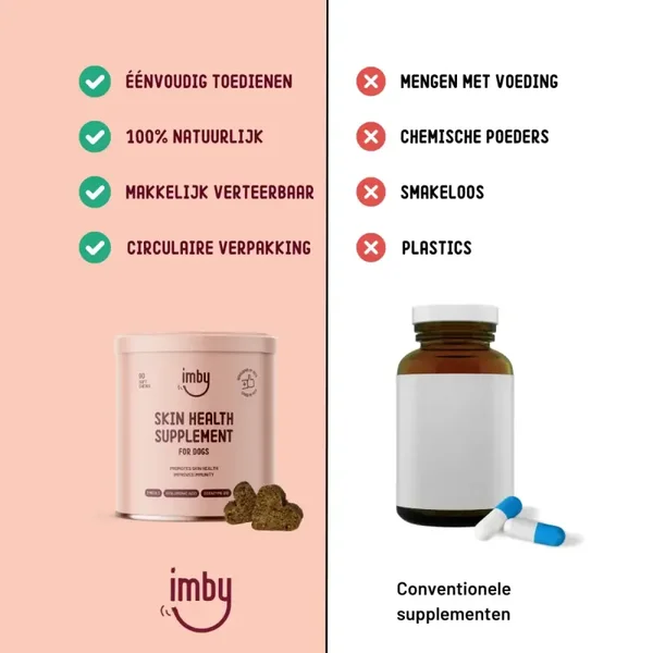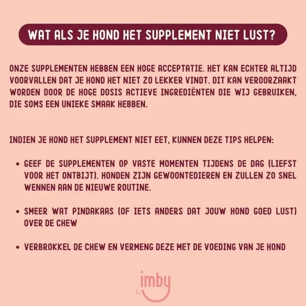 Algenolie 120 mg/chew , Probiotica: Bacillus Subtilis 1 x 10^9 CFU , Prebiotica: Cichoreiwortel 89 mg/chew, Vitamine D3 76 mg/chew, Vitamine E 23 mg/chew, Zink 11 mg/chew, Co-enzym Q10 10 mg/chew, Hyaluronzuur 10 mg/chew, Vitamine A 3.750 IE , IJzer 6 mg/chew, Biotine 5 mg/chew, Koper 1,1 mg/chew, Mangaan 0,9 mg/chew, Selenium 0.04 mg/chew