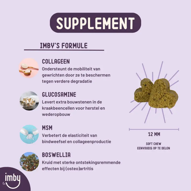 Glucosamine 240mg/chew, Collageen 159mg/chew, Magnesium glycinaat 110mg/chew, Methylsulfonylmethaan (MSM) 100mg/chew, Boswellia Serrata 75mg/chew, Algenolie 60mg/chew, Kurkuma Poeder 38mg/chew, Vitamine C 13mg/chew, Hyaluronzuur 10mg/chew, Zwarte Peper 1,1mg/chew, Mangaan-chelaat 0,9mg/chew