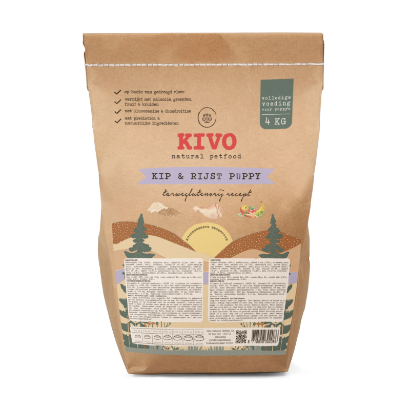 Kivo Kip & Rijst geperst | Puppy | Tarwegluten vrij | 4 kilo