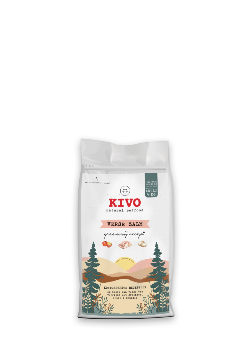 Zalm (27%; vers: 15% - gedroogd 12%), gedroogde aardappel (17.5%), aardappelzetmeel, erwten (8.4%), gevogeltevet, biergist, zalmolie (1.2%), eipoeder, gedroogde appels (0.5%), cranberry (0.3%), inuline (bron van FOS) (0.3%), gedroogde tomaten (0.2%), spirulina (0.2%), Echinacea (0.2%).
